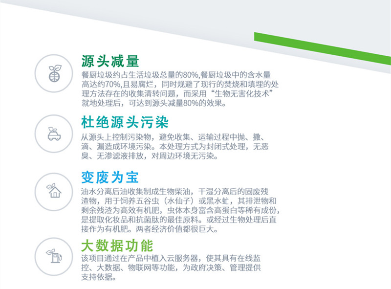 三、本公司系列設(shè)備適用餐廚垃圾就地處理和集中處理,設(shè)備應(yīng)用領(lǐng)域:大中型社會餐飲、美食城、美食街、政府機關(guān)食堂、企事業(yè)單位、學(xué)校、部隊、醫(yī)院、會議中心、車站、碼頭、機場、海艦船、大型超市、商業(yè)綜合體、農(nóng)貿(mào)市場、蔬菜基地、屠宰場、社區(qū)垃圾中轉(zhuǎn)站、旅游景區(qū)、高速公路服務(wù)區(qū)等領(lǐng)域。